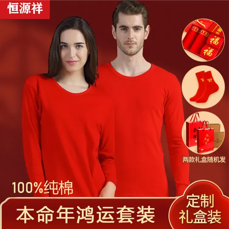 #红色喜庆 #喜庆又好看 【本命年款】恒源祥本命年大红色结婚款纯棉保暖情侣秋衣秋裤套装#品质好物